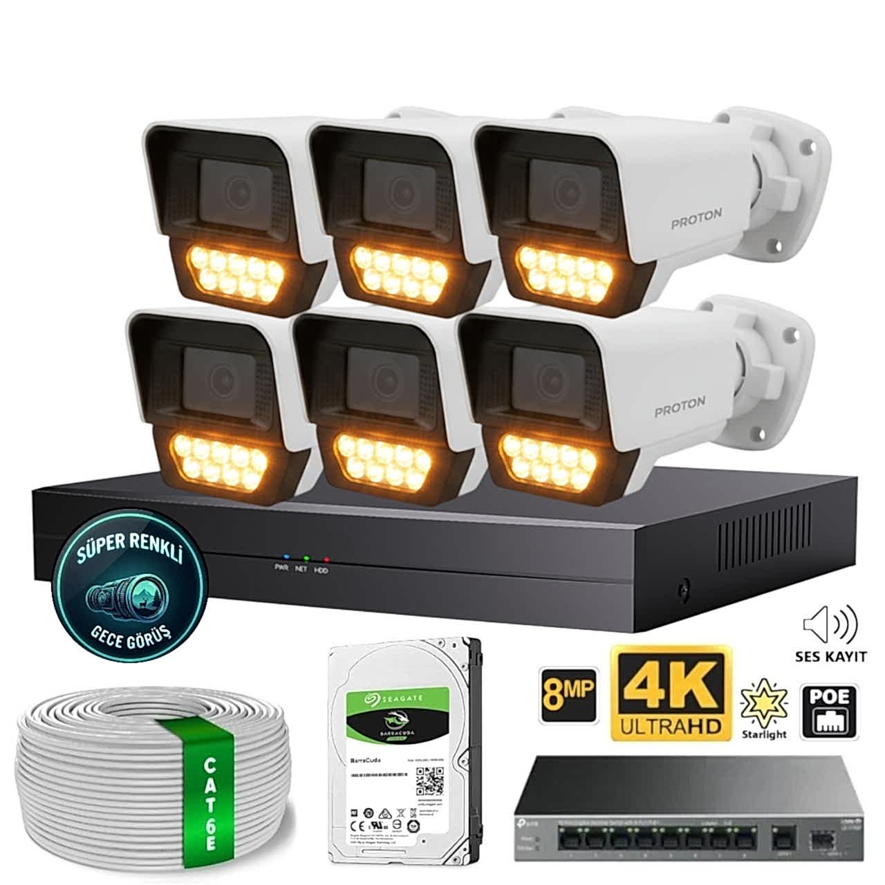 Proton 6 Kameralı Mikrofonlu Sesli 4K POE IP Kamera Seti
